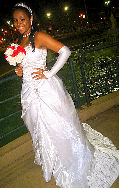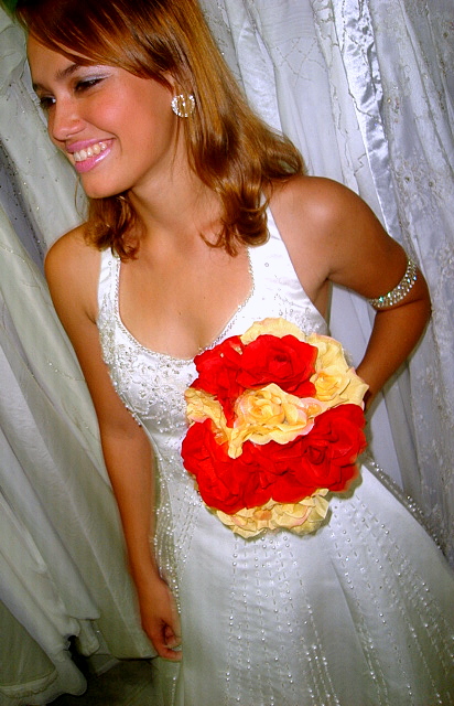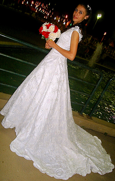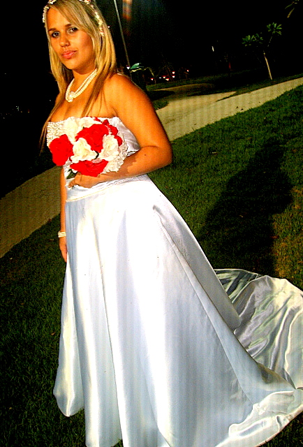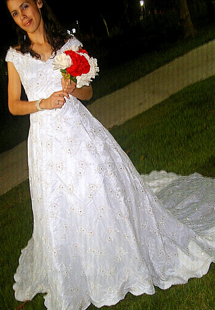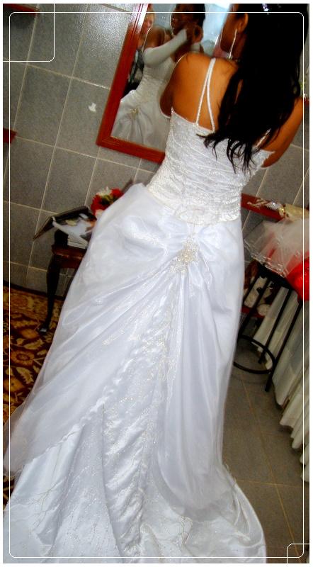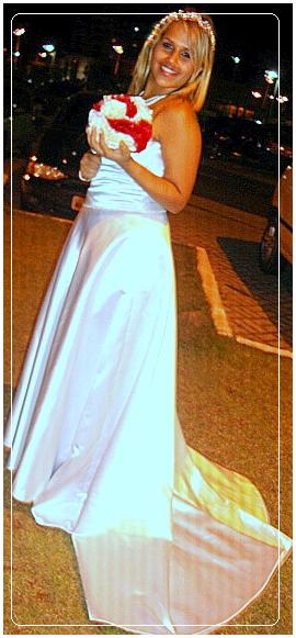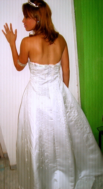 Veste tomara que caia em cetim de seda evazê cauda fixa,busto bordado em vidrilhos layser e prata e cristais svarovisk.