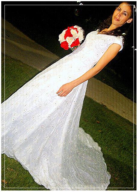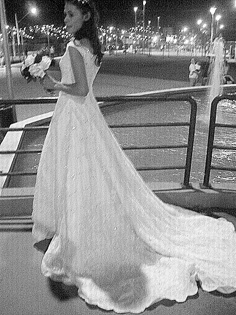 _Veste ombro a ombro em renda com enorme cauda fixa, bordado com paetês,pérolas e cristais, botões em pérolas.
